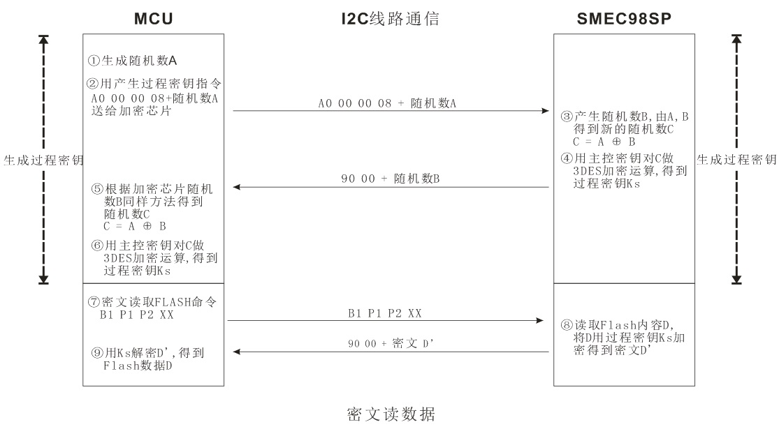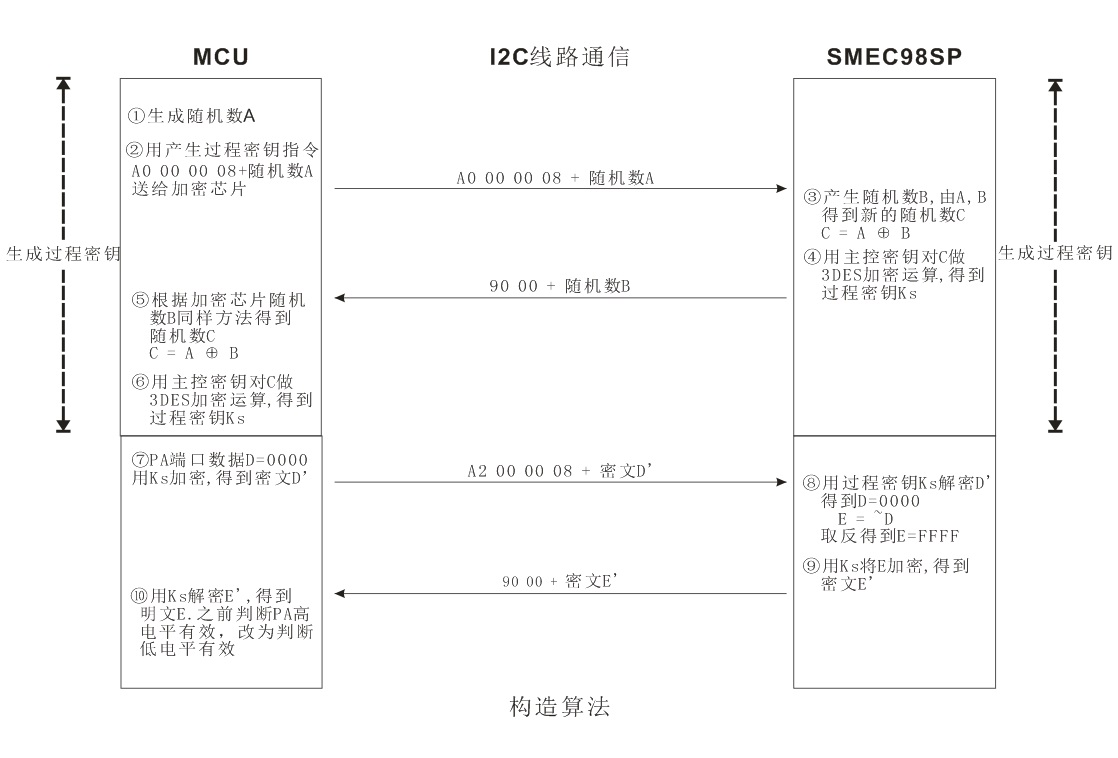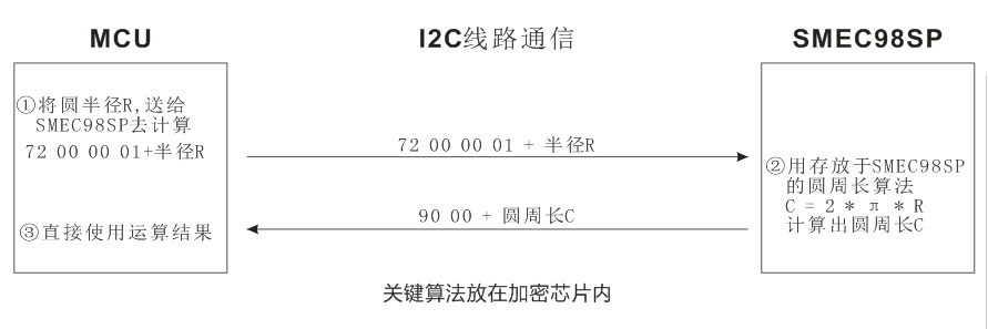 將 MCU 中的一部分關(guān)鍵代碼,放入加密芯片中運(yùn)行,當(dāng)需要用到SMEC98SP中的算法時(shí),由MCU 向SMEC98SP 發(fā)送指令,SMEC98SP 根據(jù)指令,在內(nèi)部運(yùn)行,返回結(jié)果給MCU。數(shù)據(jù)在I2C線路上傳輸,可以使用過程密鑰加密的方式傳輸。