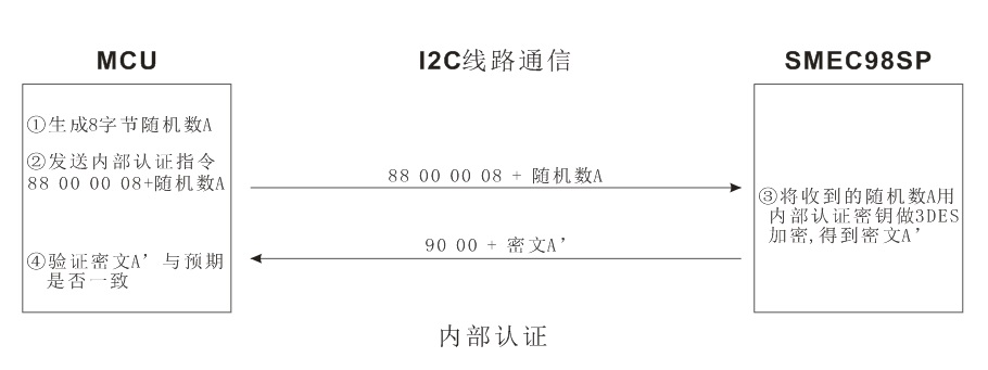 內(nèi)部認(rèn)證原理:MCU向SMEC98SP發(fā)送8字節(jié)隨機(jī)數(shù), SMEC98SP用內(nèi)部認(rèn)證密鑰將隨機(jī)數(shù)進(jìn)行3DES加密后回送給MCU, 由MCU判斷回送數(shù)據(jù)的合法性。