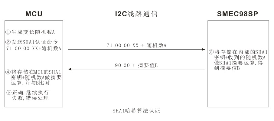 SHA1利用這種特性,可以將輸入數(shù)據(jù)前面的一部分作為密鑰值,分別存放于MCU及加密芯片中。MCU在做SHA1算法認(rèn)證時(shí),只需將部分?jǐn)?shù)據(jù)傳給加密芯片,由SMEC98SP內(nèi)部再將“密鑰值”+ “輸入數(shù)據(jù)”一起做SHA1運(yùn)算,并回送“摘要值”,MCU再判斷跟預(yù)期的值是否一致,實(shí)現(xiàn)SHA1算法認(rèn)證。