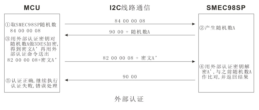 外部認(rèn)證原理:MCU先獲取SMEC98SP的8字節(jié)隨機(jī)數(shù), 然后MCU用外部認(rèn)證密鑰對隨機(jī)數(shù)做3DES加密,再將密文送給SMEC98SP,然后由SMEC98SP判斷該密文的合法性。