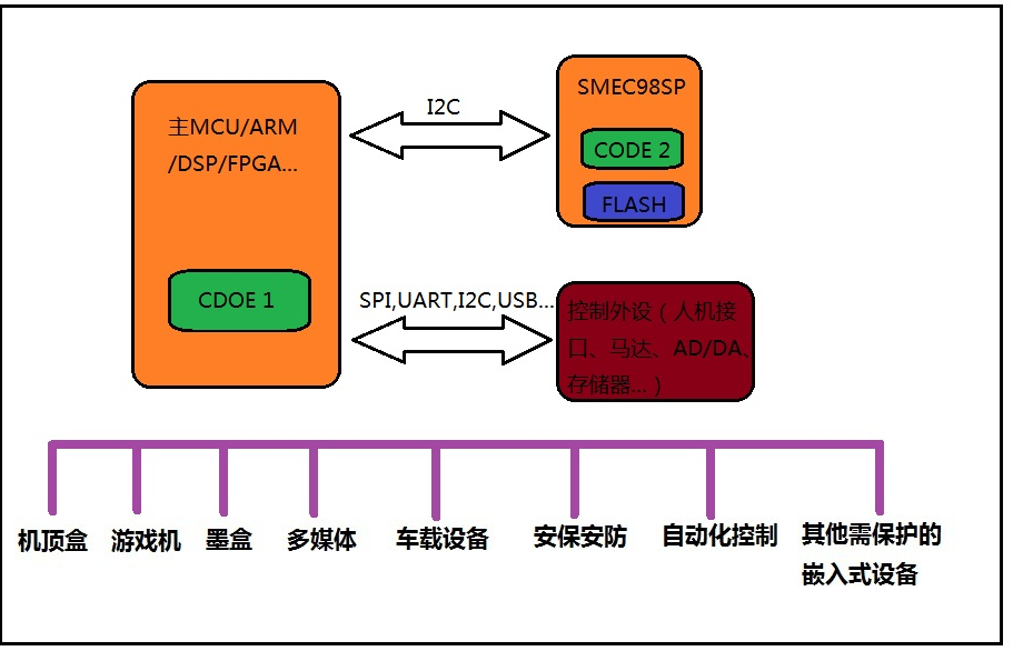 SMEC98SP采用增強型8051智能卡內(nèi)核,用戶可以把MCU中程序一部分關(guān)鍵算法下載到SMEC98SP中運行。用戶采用標(biāo)準(zhǔn)C語言編寫程序代碼,采用KEIL C編譯器,編譯并下載到加密芯片中。在實際運行過程中,通過I2C通信,獲取加密芯片中算法運行結(jié)果,并以此結(jié)果,作為MCU程序運行的輸入數(shù)據(jù)。因此SMEC98SP成了產(chǎn)品的一部分,而算法在SMEC98SP內(nèi)部運算,盜版商無法破解,從根本上杜絕了程序被破解的可能。